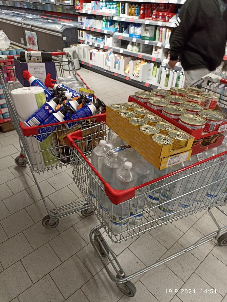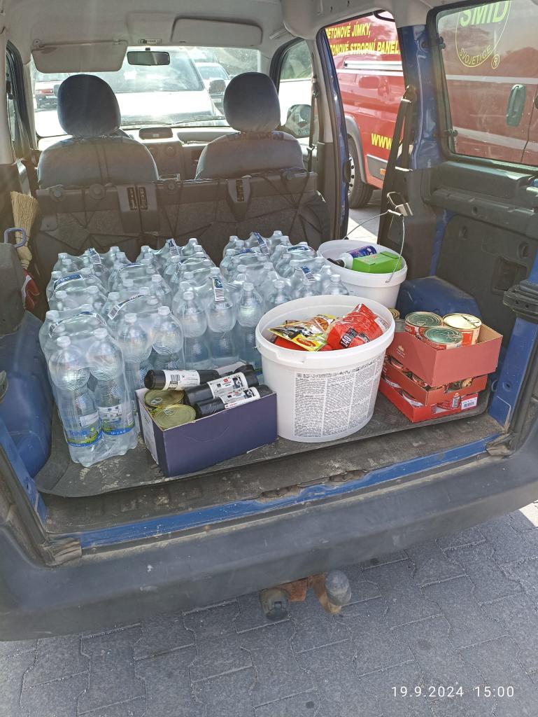 Prostředky byly nakoupeny v celkové hodnotě 8 410 Kč. Zejména dětské pleny, výživy, vlhčené ubrousky, kaše, dámské hygienické pomůcky, dezinfekční prostředky, utěrky, hadry, rukavice, rýžáky, košťata, pytle na odpad, těstoviny, konzervy, polévky, paštiky a v neposlední řadě spoustu balené vody.