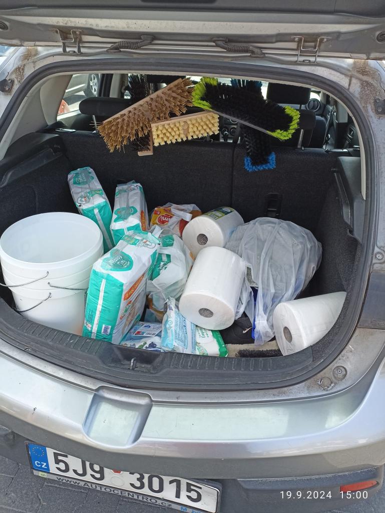 Prostředky byly nakoupeny v celkové hodnotě 8 410 Kč. Zejména dětské pleny, výživy, vlhčené ubrousky, kaše, dámské hygienické pomůcky, dezinfekční prostředky, utěrky, hadry, rukavice, rýžáky, košťata, pytle na odpad, těstoviny, konzervy, polévky, paštiky a v neposlední řadě spoustu balené vody.